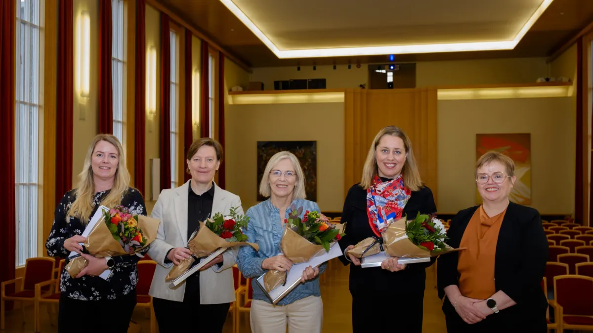Dr Berglind Eva Benediktsdóttir, Associate Professor at the Faculty of Pharmaceutical Sciences, Professor Guðfinna Th. Aðalgeirsdóttir, Professor at the Faculty of Earth Sciences, Professor Guðbjörg Linda Rafnsdóttir, Professor at the Faculty of Sociology, Anthropology, and Folkloristics, and Dr Toby Erik Wikström, Project Manager at the Graduate School, were today presented with an award in recognition of their commendable service to the University of Iceland (UI). Silja Bára R. Ómarsdóttir, Rector of the University of Iceland, presented the awards at a staff briefing held in the University's Ceremonial Hall.